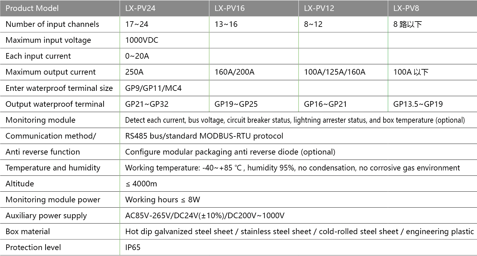 ● The power module inside the combiner box can be connected to a photovoltaic voltage of up to 1000DCV;